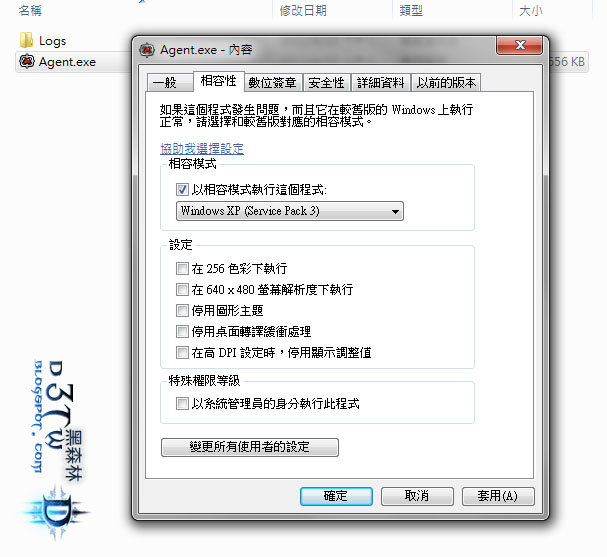 右鍵設定 Agent.exe 的屬性,必且將相容性改為Win XP SP3 確定
